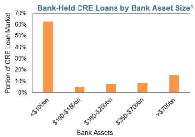 • The US banking sector’s importance to commercial real estate cannot be ignored as it finances roughly 40% of the total CRE debt outstanding. Larger-sized banks’ exposure to CRE loans is relatively small, owing to greater diversification across business lines and loan books. In contrast, a meaningful number of smaller-sized regional banks, particularly those with less than $100 billion in assets, have CRE exposures of 25% or more of their overall outstanding loans. The smaller banks account for a significant portion of total bank CRE lending.