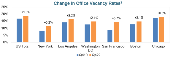 • The office sector has garnered its share of headlines recently. Not surprisingly, the sector is facing many headwinds from transitioning out of the COVID-driven work-from-home model into the hybrid model. Fundamentals have been challenged with the record pace of rate hikes, hiring freezes and tech sector layoffs, and a potential impending recession. This has resulted in slower rent growth – which has fallen to just 1% annually – and higher vacancy rates – above both pre-COVID levels and the 2010 peak.