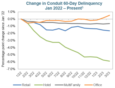 • However, spread volatility should persist given the growing uncertainties across markets. Headlines will continue to pressure conduit and SASB deals with high office exposure, but the initial widening due to the banking pressures seems to have peaked. A potential recession, the health of the consumer, and regional bank CRE lending will also impact the direction of spreads and the market’s ability to work through upcoming maturities.