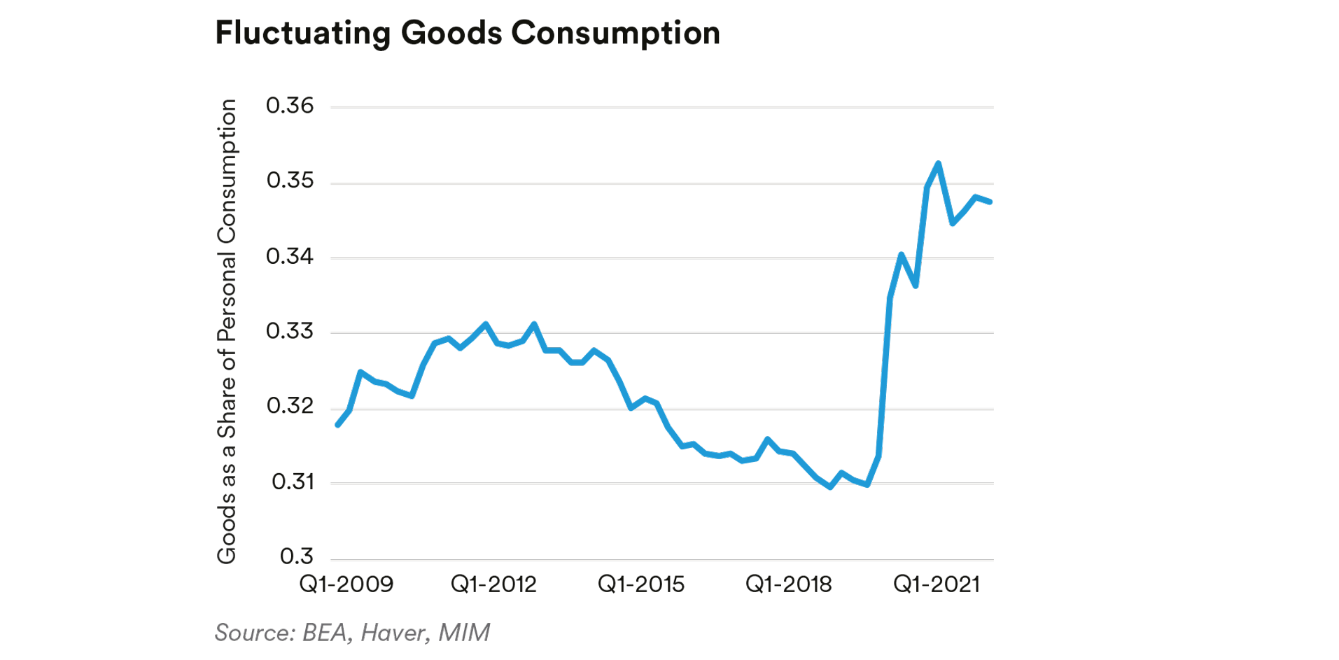 Spending Composition. Consumers shifted their spending from services to goods at the start of the pandemic, resulting in a spending shift of nearly $1.5 trillion away from services. As a share of total consumption, services remain well below prepandemic norms at 65.3% (compared with 69.0% in Q4 2019). Forecasting consumers’ future mix of goods and services is extremely difficult at this point. Goods consumption has settled in close to its peak. After spending months at those elevated shares, it’s not clear how quickly—and to what long-term trend—goods consumption will migrate. The shift toward services appears to be taking place, but services tend to be a relatively slow-moving series—they tend to be linked to habits or contracts, which are harder to restart (e.g., gym memberships, daily lunch at work). This could mean that the rebalancing could take a substantial amount of time.