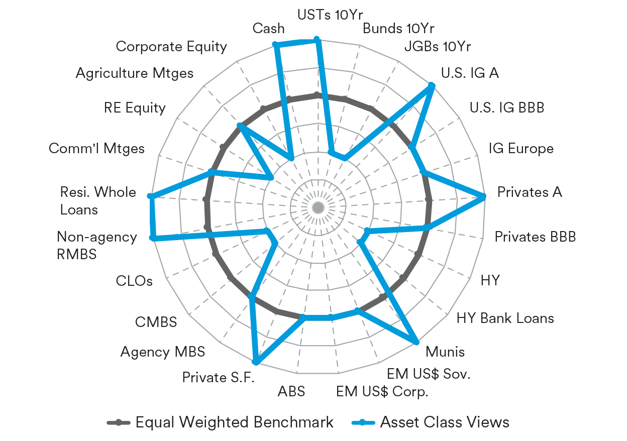 1. The asset class views in the chart above are solely based on our macroeconomic views, sector fundamentals, and market expectations by the authors, which may be different from MetLife's, Portfolio Managers' and sector strategist views, which are included in this report. For illustrative purposes only.