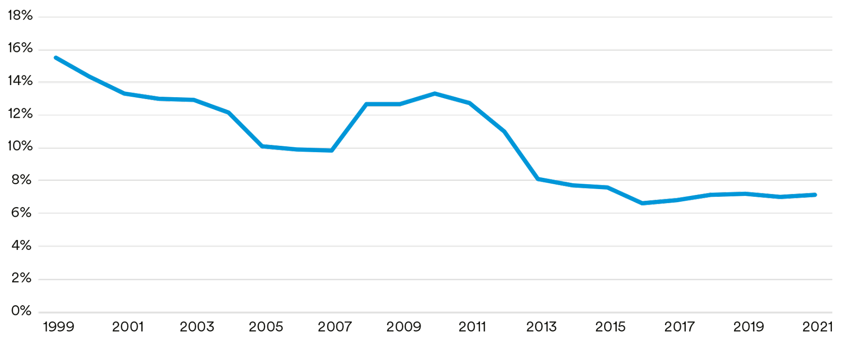 Among the housing units that have been built, most have been geared for higher income households. Construction of moderately sized and affordable homes has rapidly declined over the past 30 years. In the single-family space, for example, homes below 1,400 square feet made up 16% of all new construction in 1999 but made up just 7% of construction in 2021 (exhibit 1). A similar trend is observable in the multifamily sector.
