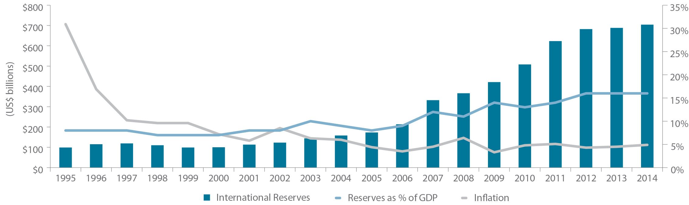 FIGURE 2 | TRENDS IN PLAE FOREIGN EXCHANGE RESERVES AND INFLATION