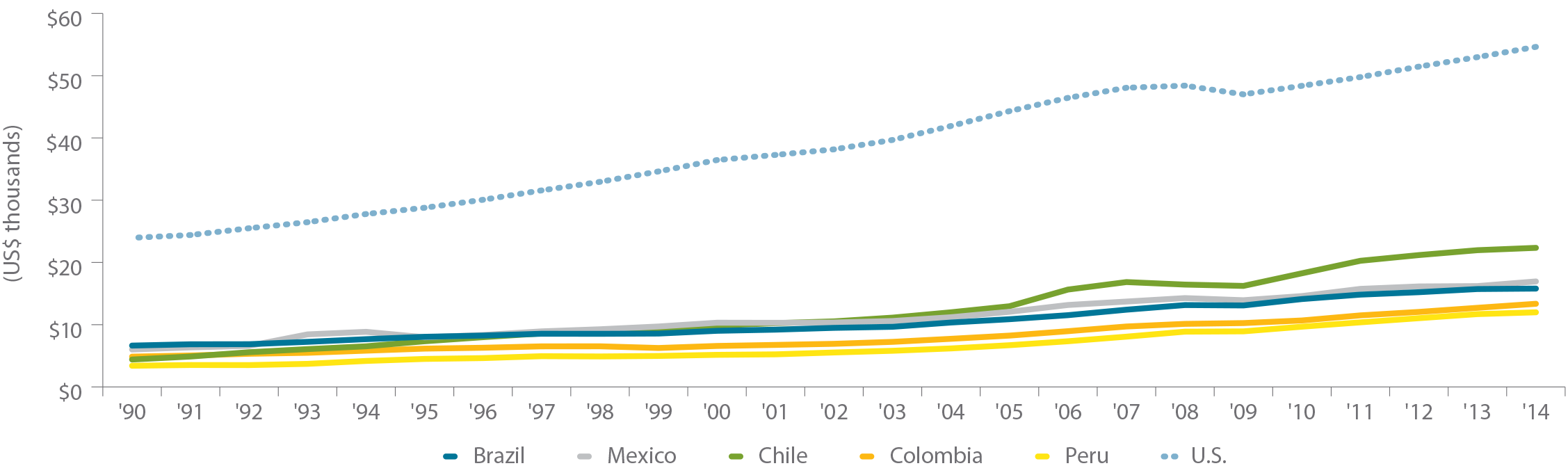 The evolution of per capita GDP in the region has been impressive even though it is still a fraction of US per capita GDP, as shown in Figure 5. Higher disposable incomes have created demand for not only increasingly sophisticated consumer products, but also services, such as health and education, for which government-provided alternatives are weak. Additional demand and continued growth in per capita GDP will require major investments that will create direct and indirect private equity opportunities.