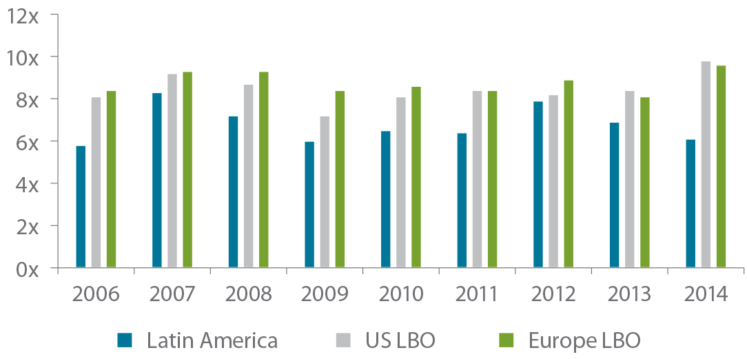 StepStone compared data on private equity entry multiples from 139 Latam transactions in its proprietary SPI database from 2006-2014 to LBO entry multiples in the US and Europe tracked by S&P Capital IQ. On average, Latam managers have transacted at significant and consistent discounts to both markets, as shown in Figure 6. Currently multiples of 4x to 6x EBITDA are not uncommon in Middle Market transactions, and leverage is significantly lower than developed markets, seldom going over 3x EBITDA.