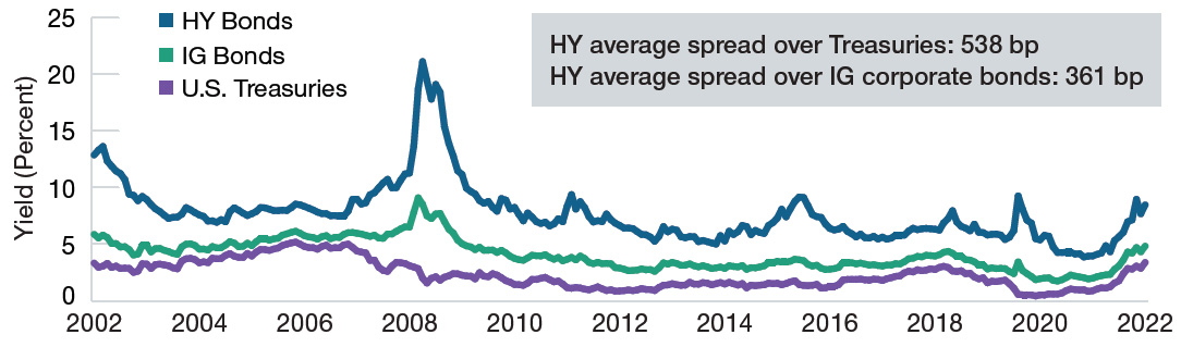 High yield bonds are often considered to be a hybrid asset class because they tend to exhibit characteristics of both fixed income and equities. Like most other fixed income securities, high yield bonds offer a steady stream of income in the form of coupon payments, which averaged 7.40% over the 20 years ended August 31, 2022.1