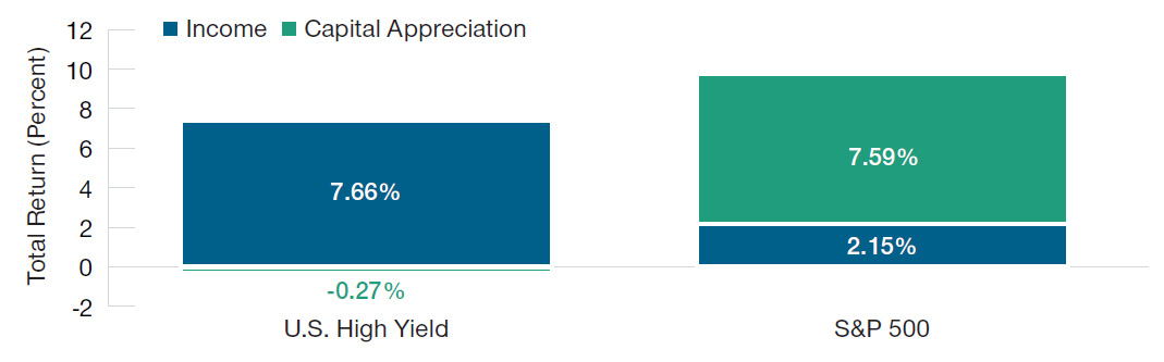 Most high yield bond portfolio managers focus on opportunities for both income and price appreciation as they invest. However, an analysis of historical sources of return shows that, unlike stocks, high yield bonds have typically derived the majority of their long‑term total returns from income rather than capital appreciation.