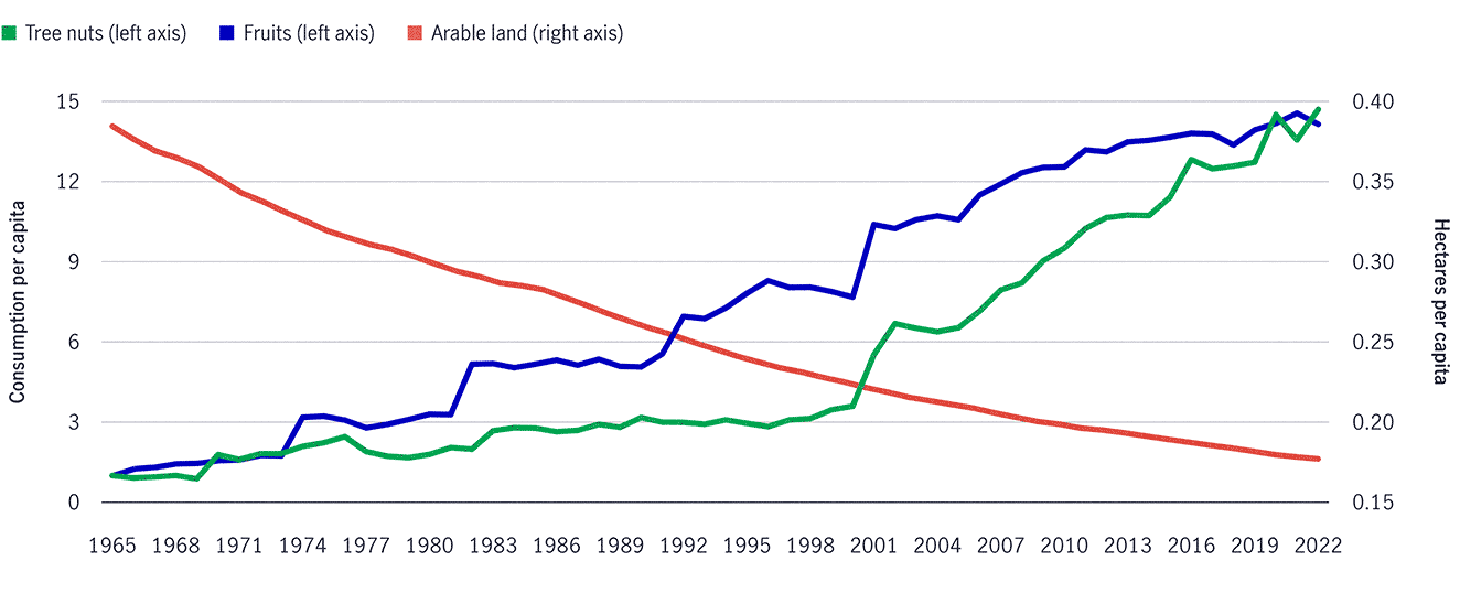 Source: ITC Trade Map, as of August 31, 2023. While there are challenges associated with trading in agriculture, there are also opportunities. The loss for the U.S. soybean sector was a gain for Brazil, which has replaced the United States as China’s leading soybean supplier, even after a truce was reached between the United States and China in 2020. And when China imposed tariffs on U.S. farm products, U.S. almonds were also affected, with increasing consumption of almonds in China relying on imports to meet its vast domestic demand. Australia, the largest almond production region in the southern hemisphere, increased its almond exports to China in 2018 and 2019, resulting in its negligible pre-2018 exports to China rising to an average of $250 million from 2019 to 2022. In this case, the challenges experienced by one region’s exports once again resulted in lasting opportunities for another market.