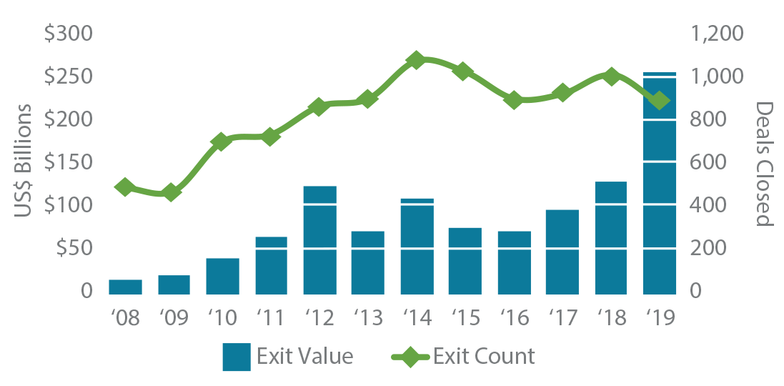 Although the time to liquidity has extended significantly, thankfully, exit values have also increased for VC-backed companies. In 2019, VC-backed exits generated nearly US$260 billion across 882 transactions in the US alone (Figure 6). Total exit value for the year was 162% higher than the rolling five-year average even though there were 11% fewer deals.