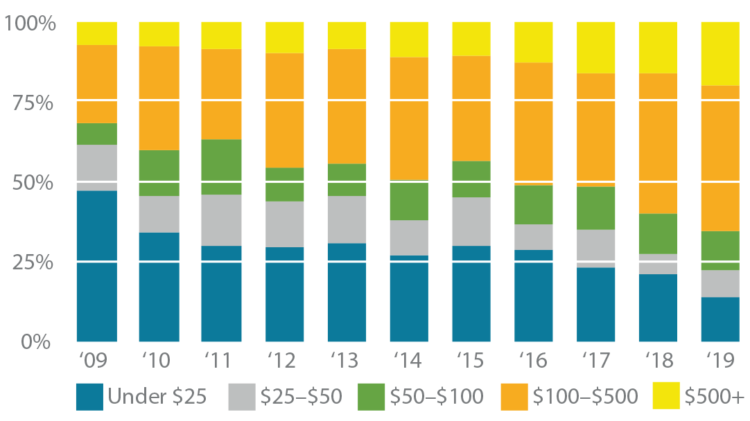 A clear separation between the “haves” and “have nots” has emerged. The 25 largest VC managers have collectively raised more than 50% of all LP commitments over the last decade (even excluding the US$100 billion SoftBank Vision Fund). At the same time, hundreds of new seed funds have emerged. In 2018, funds smaller than US$250 million may have accounted for 74% of all new VC funds raised, but they represented only 16% of the total dollars raised. By contrast, funds larger than US$500 million accounted for 12% of new funds raised, but represented 66% of the total capital raised.2