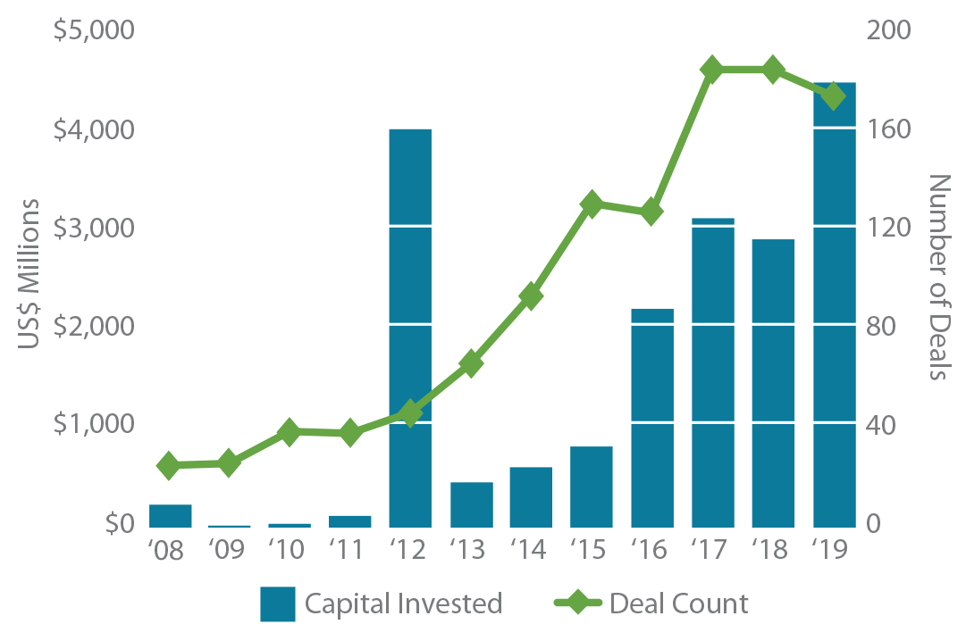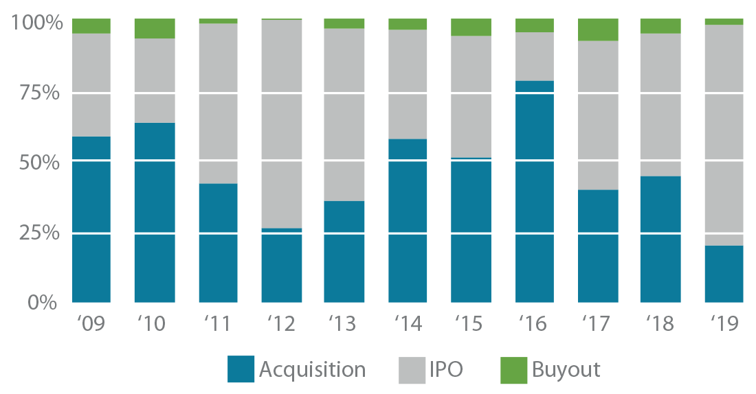 As seen in Figures 1–3, 2018 was a banner year, and that momentum largely continued into 2019. The IPOs of high-profile companies Uber, Zoom, Slack, Pinterest, and Lyft led the way for what was a record year for exit value. This is certainly a welcome development for the LPs that have waited a decade or more to realize these gains and have been constrained in their ability to commit more capital to the asset class.
