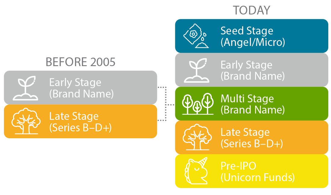 The long hold periods and winner-take-all market dynamics inherent in IT have in many ways shifted the advantage to larger “brand name” VC funds, which have the capacity to invest in their best companies throughout their life cycle. These larger funds focus on Series A rounds but have the flexibility to invest from seed to pre-IPO. Premium fees and massive fund sizes often require these GPs to effect multiple US$10 billion+ outcomes per fund, something that very few have been able to do consistently.